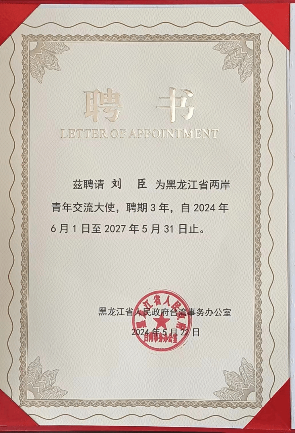 (任凯/文)近日,黑龙江省人民政府台湾事务办公室举办“黑龙江省两岸青年交流大使”受聘活动。我校音乐学院院长刘臣教授因在海峡两岸青年交流中发挥出的积极作用,获“黑龙江省两岸青年交流大使”殊荣。