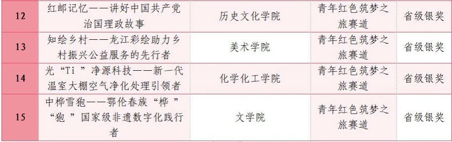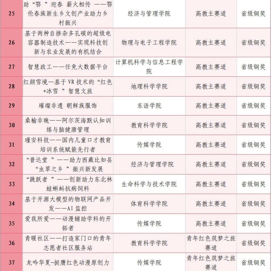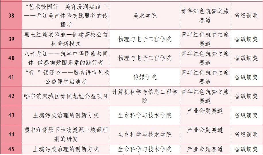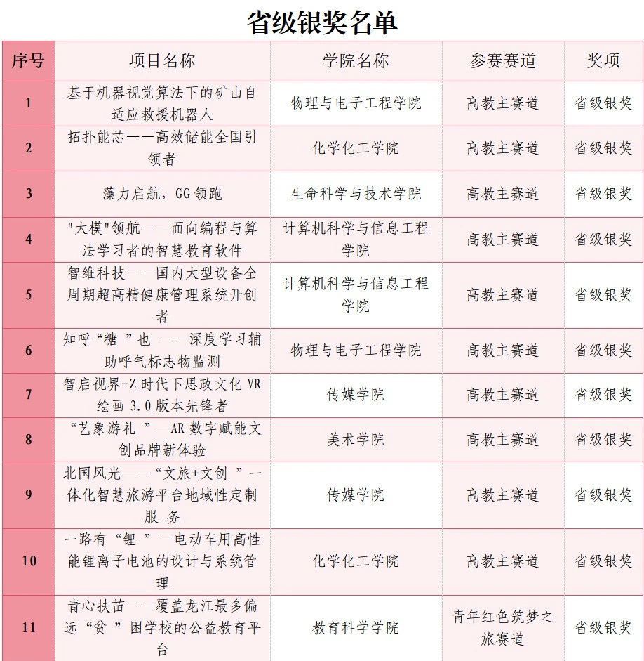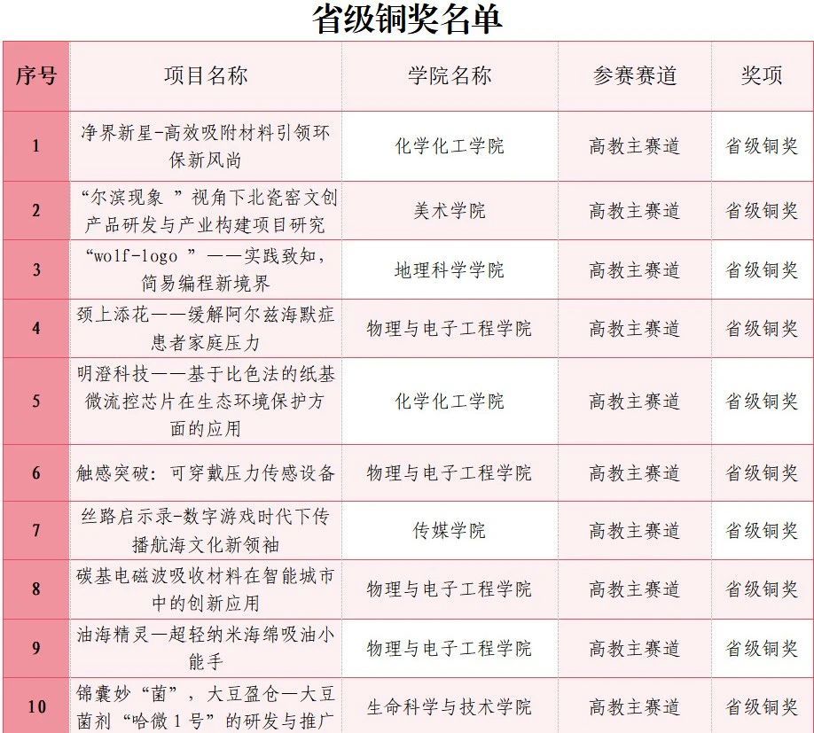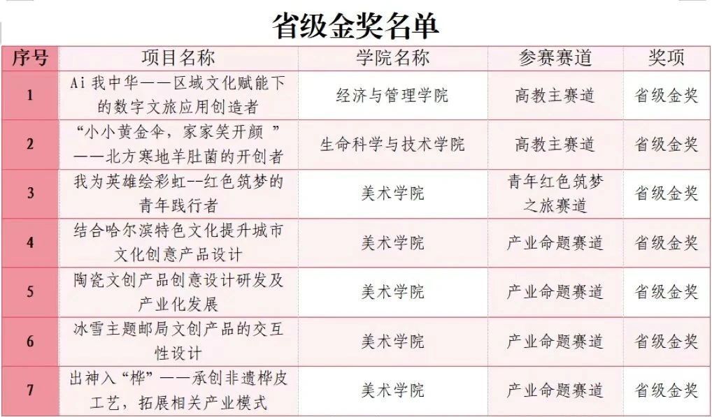 (许鑫/文)近日,中国国际大学生创新大赛(2024)黑龙江赛区决赛结果公布,大赛历时近2个月,历经“高教主赛道”“‘青年红色筑梦之旅’赛道”“产业命题赛道”决赛、排位赛、集训营后圆满落下帷幕。我校共斩获金奖7项、银奖15项、铜奖45项,获奖总数较去年增长11项、金奖增长2项,获奖数量及等级再创历史新高。