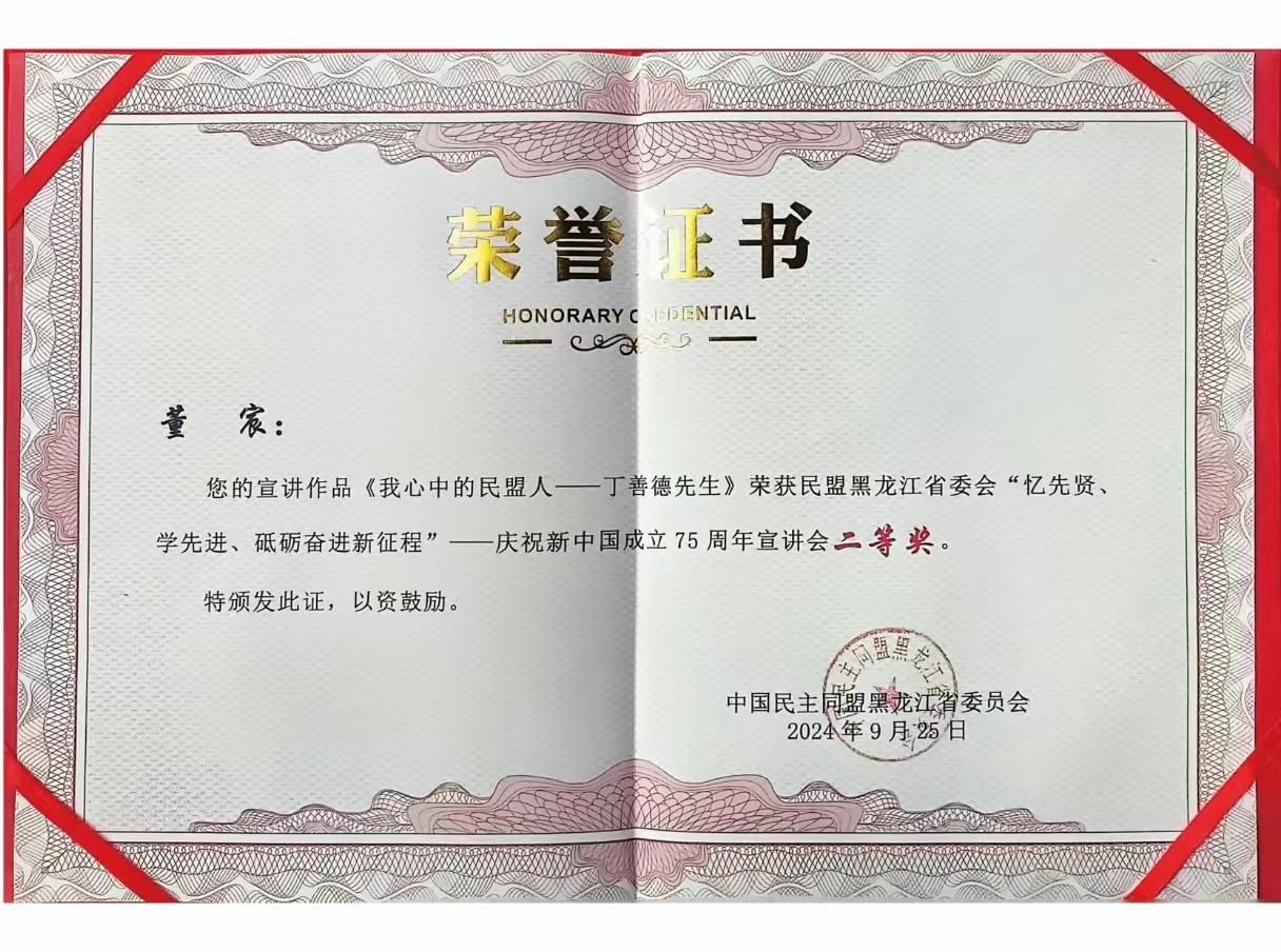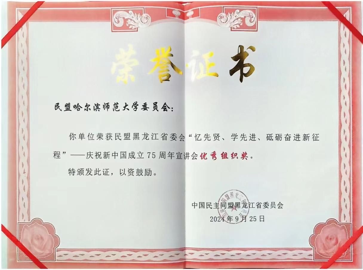 (杨超/文)近日,民盟黑龙江省委会通报表彰盟省委组织的“忆先贤、学先进、砥砺奋进新征程”——庆祝新中国成立75周年宣讲会优秀组织单位和个人,民盟哈师大委员会荣获此次宣讲会优秀组织奖,盟员、优秀青年作曲家董宸宣讲的作品《我心中的民盟人——丁善德先生》荣获此次宣讲会二等奖。