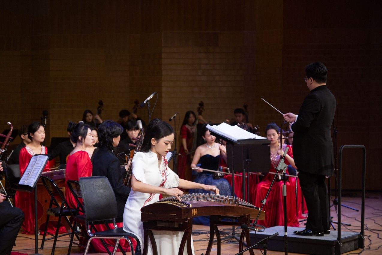接续下来的是古筝协奏曲《云裳诉》,曲调深沉廻转、委婉缠绵,作品情意绻缱、曲折动人,是筝曲中的佳作。演奏者董思艺用精湛的技艺传递着乐曲的情思,表演丝丝入扣,与乐团演奏完美相生,将游子思乡的情愫进行艺术化的呈现。