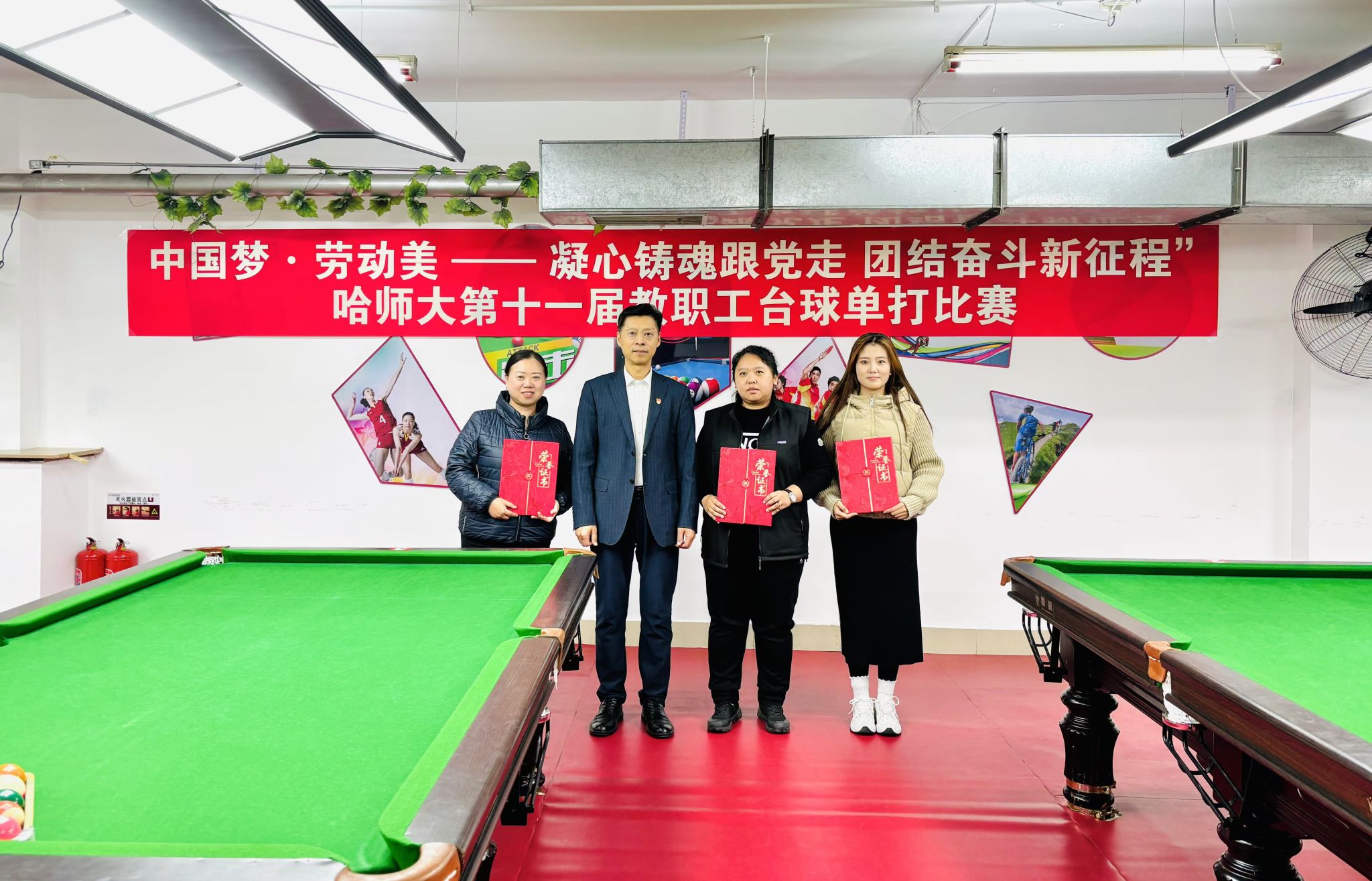 (万浩然/文)10月24日,由校工会主办,教职工台球协会承办的“中国梦·劳动美——凝心铸魂跟党走 团结奋斗新征程”哈师大第十一届教职工台球单打比赛经过四天的激烈角逐,在我校松北校区教职工活动中心圆满落幕,共有来自17个基层工会的百余名教职工参加比赛。
