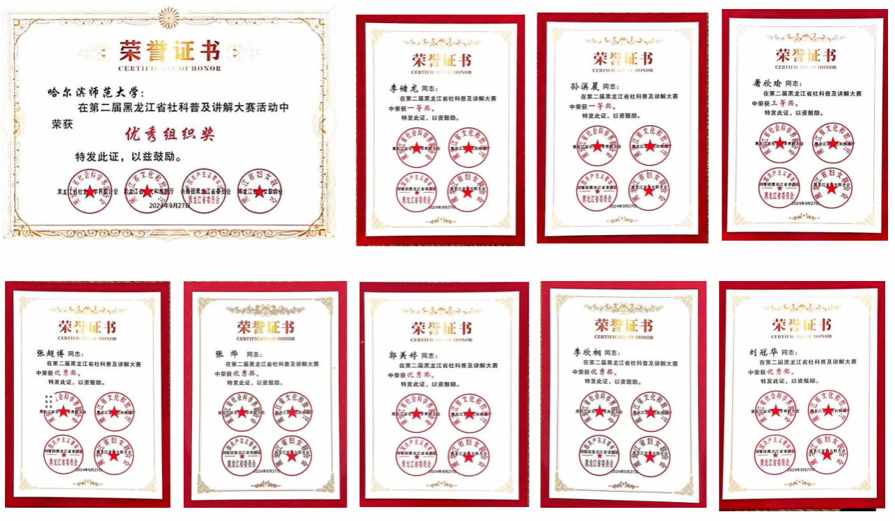 (祁博/文)在9月27日举办的第二届黑龙江省社科普及讲解大赛中,我校学生李储龙和孙溪晨凭借深厚的专业知识、出色的表达能力和创新的讲解方式,从众多选手中脱颖而出,荣获一等奖;屠欣瑜荣获三等奖;张超博、张烨、郭美婷、李欣桐、刘冠华荣获优秀奖。同时,我校荣获优秀组织奖。