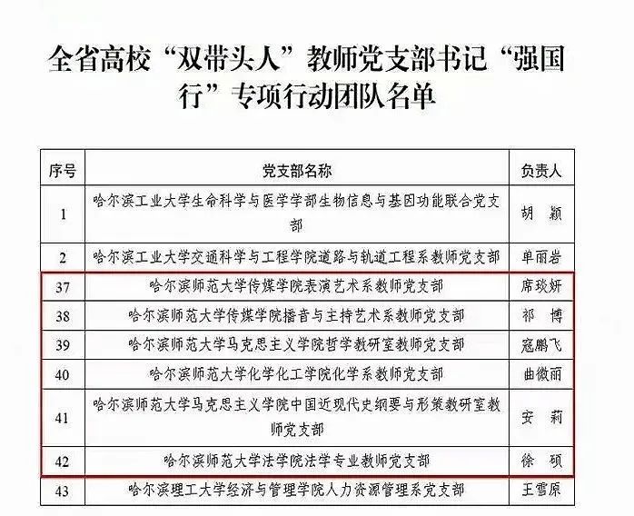 近日,省委教育工委公布了《关于全省高校“双带头人”教师党支部书记“强国行”专项行动团队名单的公示》,我校马克思主义学院哲学教研室教师党支部、中国近现代史纲要与形策教研室教师党支部、传媒学院表演艺术系教师党支部、播音与主持艺术系教师党支部、化学化工学院化学系教师党支部、法学院法学专业教师党支部6个支部成功入选。