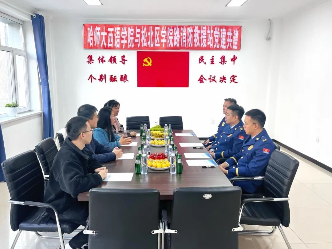 为深入贯彻落实新时代党的建设总要求,进一步探索党建创新,2024年11月9日下午,西语学院党委与松北区学院路消防救援站开展党建共建活动。西语学院负责同志和消防救援站政治指导员张玉清、救援站站长艾赓滨、救援站副站长陈达参加会议。