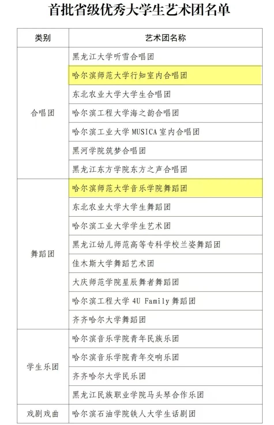 为深入贯彻《教育部关于全面实施学校美育浸润行动的通知》(教体艺〔2023〕5号)及《黑龙江省全面实施学校美育浸润行动工作方案》(黑教发〔2024〕22号)的决策部署,积极构建具有龙江地域特色的美育品牌,助力学校美育事业高质量发展,推动构建课堂教学、第二课堂、校园文化”三位一体“育人体系,近日,在黑龙江省教育厅举办的首批优秀学生艺术团遴选活动中,我校行知室内合唱团和音乐学院舞蹈团成功入选。(全省入选20个团队)