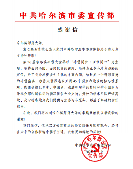 在以亚洲45个国家和地区的标志性景观为基础打造的特色冰雕建筑群中,我校历史文化学院世界史、中国史和旅游管理专业的教师和学生团队为景观介绍和解说词的撰写提供了专业支持,受到哈尔滨市委宣传部致信感谢。