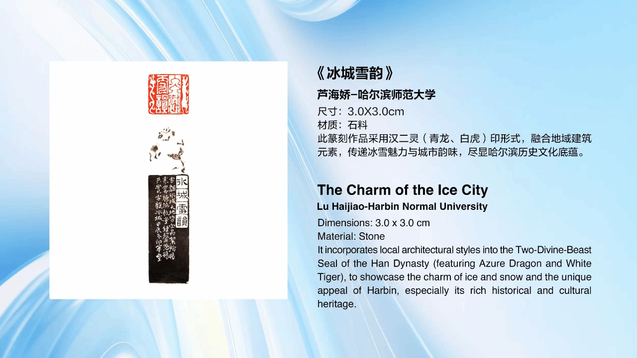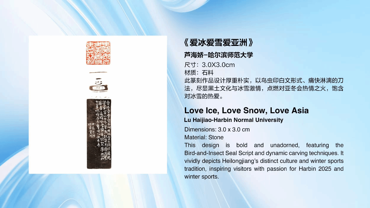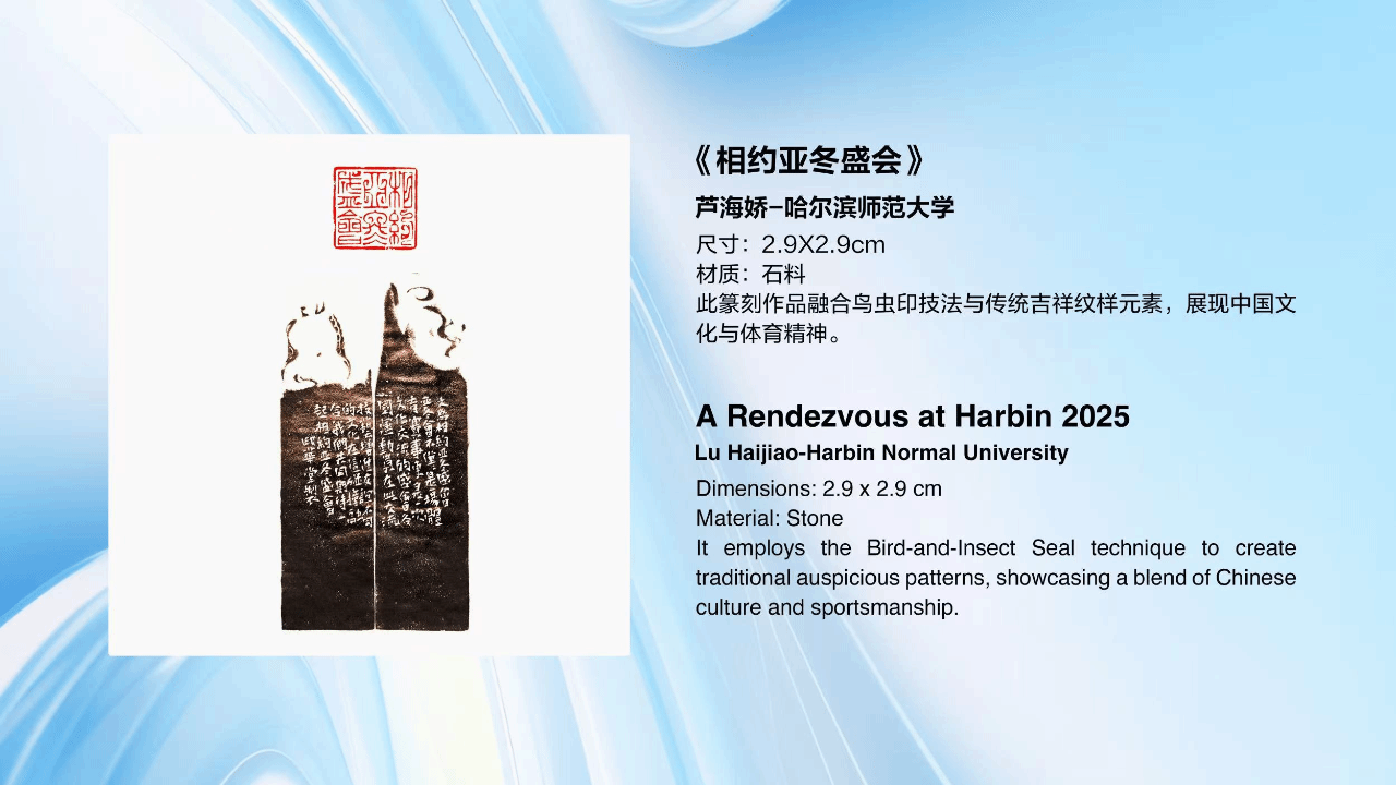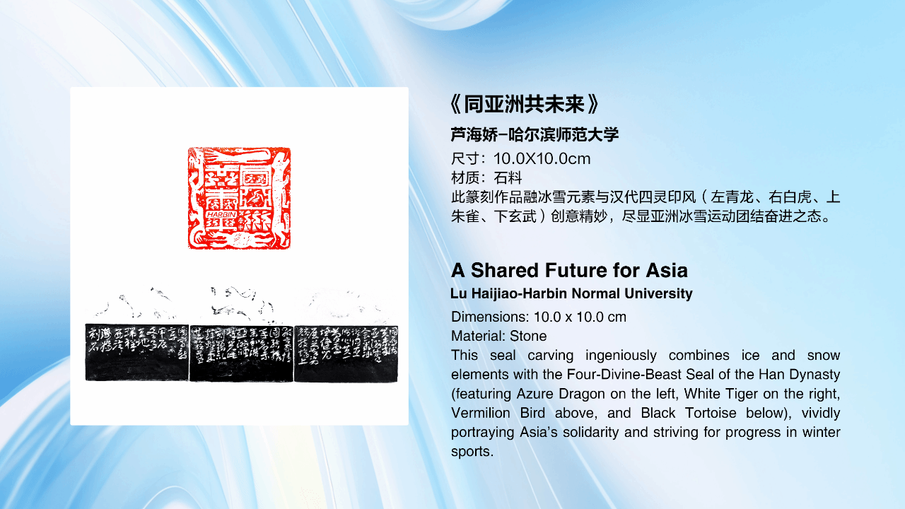 与此同时,芦海娇还带领美术学院青年教师闫永全,书法学专业研究生裴沫涵、曾嘉,本科生盛如意一起创作了篆刻文化体验互动打卡系列作品,着力让每一位来宾尽情享受这场彰显亚洲风采、中国气派、龙江特色、冰城魅力,铭刻“冰雪同梦、亚洲同心”文化符号的体育盛会。