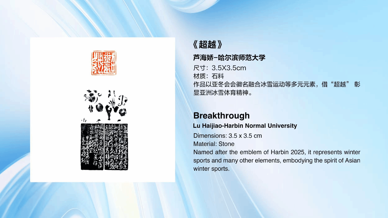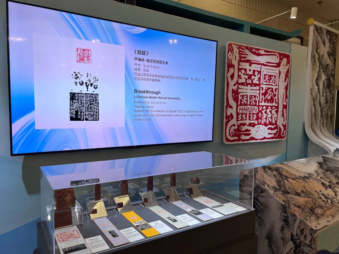 哈尔滨2025年第9届亚洲冬季运动会启幕之际,为让广大媒体朋友充分了解感受魅力无限的大美龙江,亚冬会执委会新闻宣传与媒体运行部精心策划,于2月4日至14日,在亚冬会主媒体中心推出“双亚冬之城哈尔滨2025年第9届亚冬会主题文化展览”。展览共分为魅力之都哈尔滨主题展、双亚冬之城展和亚冬会文化艺术展三大版块。我校美术学院书法系主任、硕士研究生导师芦海娇副教授共有6幅作品入选亚冬会主题文化展览“冰雪情长 印鉴亚冬———篆刻文化艺术展”,向世界、向亚洲传递中国文化,展现大美龙江,彰显冰城魅力,亮出师大名片!