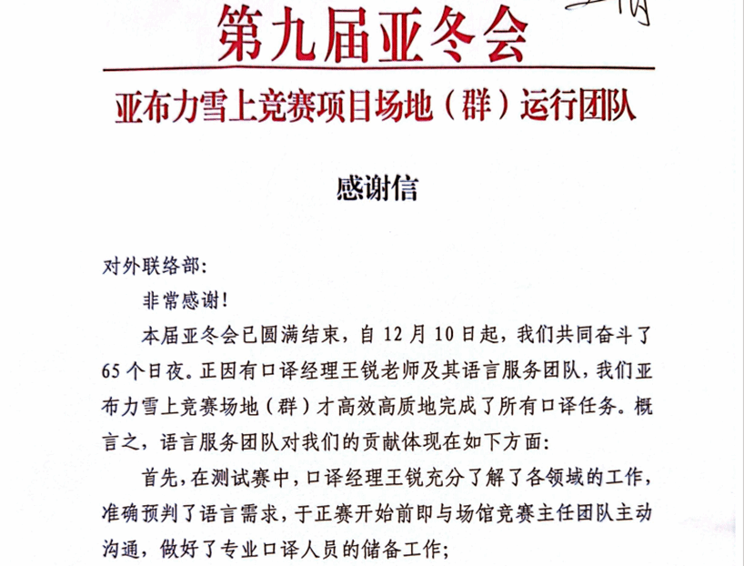 亚冬会期间,他们的身影活跃在所有需要语言服务的地方,冰上场馆、雪上赛道、运动员村、主媒体中心……是他们的组织协调和辛苦付出,让医疗翻译、竞赛技术翻译、赛后媒体采访翻译以及安保工作等顺利进行。为了“家门口”的体育赛事成功举办,为了展示出哈师大人服务大局、奋勇担当的精神面貌,他们不畏苦、不怕累,以高质量的工作成效获得了一封又一封感谢信!