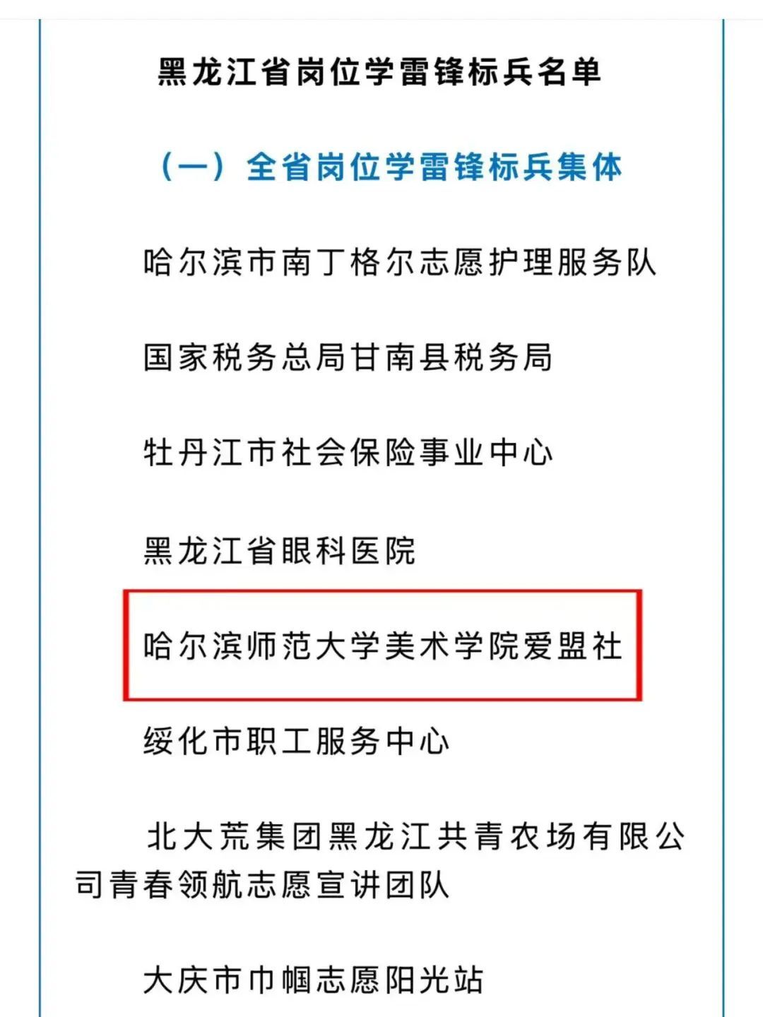 3月5日,中共黑龙江省委宣传部发布关于命名第十一批全省岗位学雷锋标兵的决定,我校美术学院爱盟社凭借卓越的社会服务贡献和深入践行雷锋精神,荣获“全省岗位学雷锋标兵集体”称号,是我省高校唯一入选的团队!