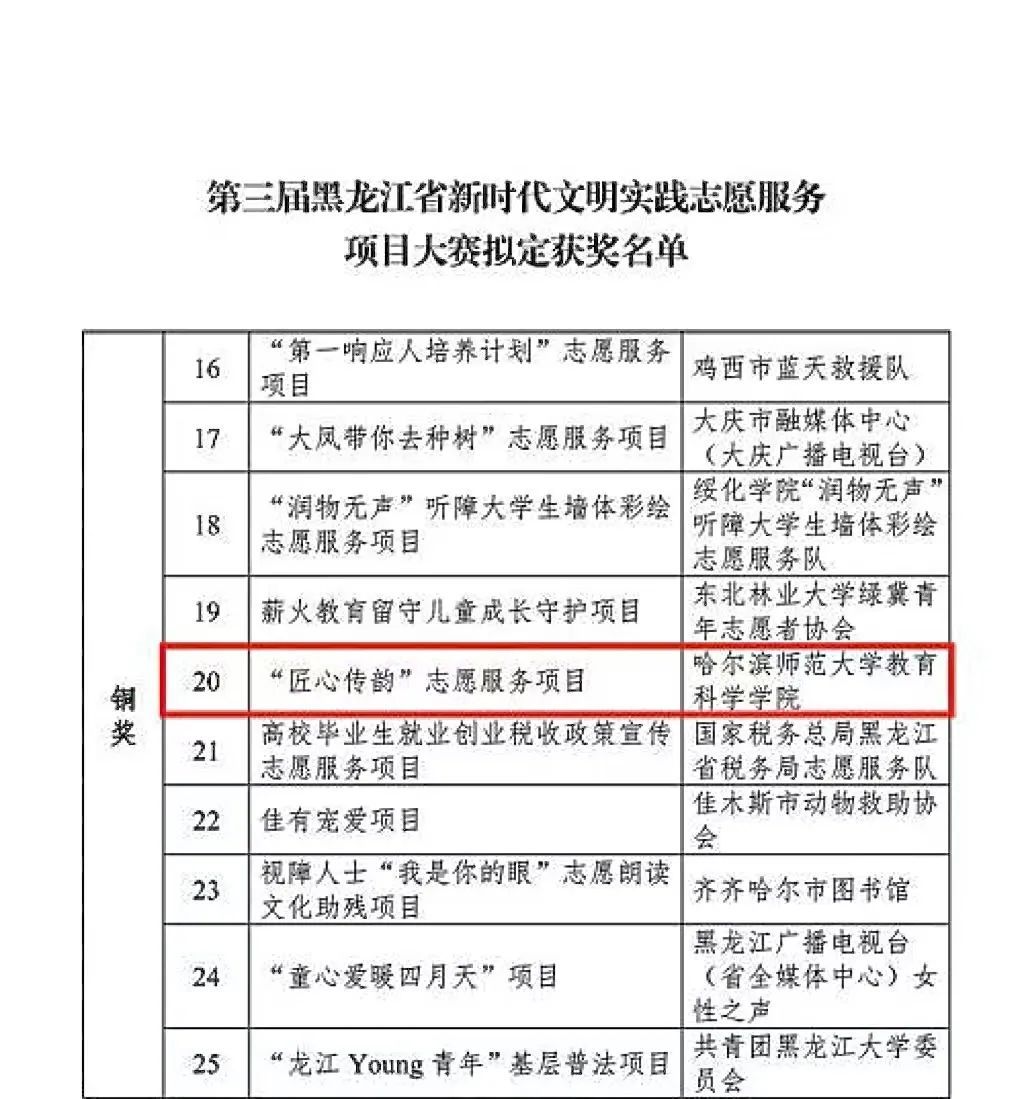 2月17日,由省委社会工作部、省委宣传部(省文明办)在全省举办的第三届黑龙江省新时代文明实践志愿服务项目大赛圆满落下帷幕。经过申报推荐、资格审查、评委终评等环节,我校教育科学学院“匠心传韵”志愿服务项目斩获大赛铜奖!