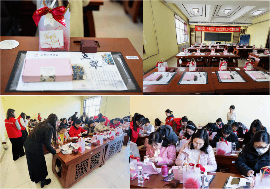 为丰富我校女教职工的精神文化生活,提升艺术修养和创造力,展现新时代女教职工的风采与魅力,3月20日,由校工会联合匠心传韵辅导员工作室精心策划的“师韵花语 巧手匠心”女教职工手工制作活动圆满落下帷幕,学校部分女教职工代表及工会同志参与此次活动。