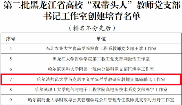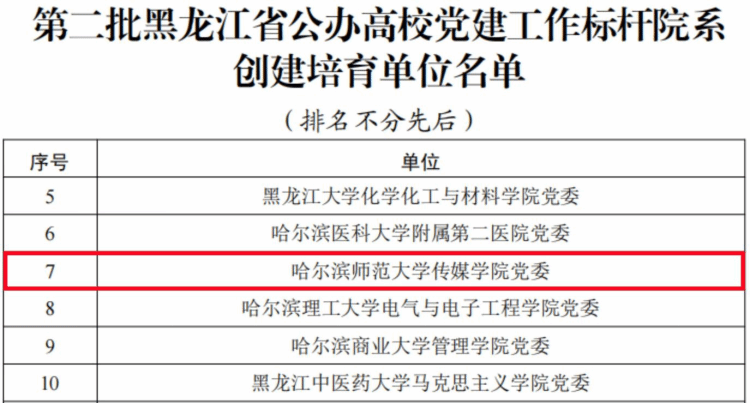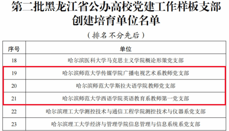 近日,省委教育工委公布了第二批黑龙江省公办高校党建“示范创建”名单和第二批黑龙江省高校“双带头人”教师党支部书记工作室、首批黑龙江省高校“研究生样板党支部”创建培育名单。其中,我校传媒学院党委获批“省党建工作标杆院系”创建培育单位,传媒学院广播电视艺术系教师党支部、斯拉夫语学院教师党支部、西语学院英语教育系教师第一党支部获批“省高校党建工作样板支部”创建培育单位,马克思主义学院哲学教研室教师支部寇鹏飞工作室获批“省高校‘双带头人’教师党支部书记工作室”创建培育单位,马克思主义学院研究生第二党支部获批“省高校研究生样板党支部”创建培育单位。