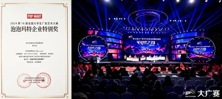 11月23日,第16届全国大学生广告艺术大赛全国颁奖盛典在中国传媒大学举行。我校作为黑龙江赛区承办院校参加颁奖活动。我校荣获“优秀赛区”(承办院校),传媒学院教师张松波荣获“优秀组织工作者”,传媒学院教师张松波、美术学院教师周明明等指导的作品获全国二等奖5项,传媒学院教师李玉玲、美术学院教师黄茜等指导作品获全国三等奖6项,传媒学院教师张松波指导的作品获泡泡玛特企业特别奖二等奖1项。