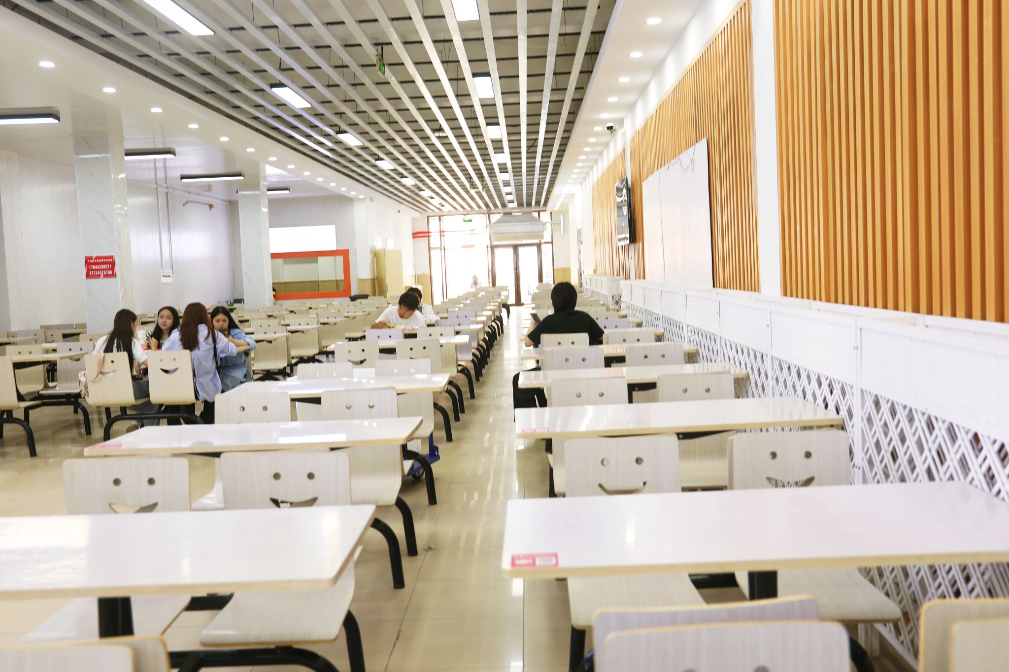 升级后的百谷园食堂呈现“一廊两区”的全新布局——“艺飨时光”艺术走廊串联起“艺飨餐厅”与“时光餐厅”两大就餐区域。整体采用现代简约装修风格,以“简约、明亮、整洁、规范”为主基调,对就餐空间进行科学规划:新增四人桌及舒适卡座等多元就餐位,满足师生单人用餐、好友小聚等不同场景需求;全面升级空调与通风系统,营造恒温舒适的就餐环境,让师生在就餐时更感惬意。