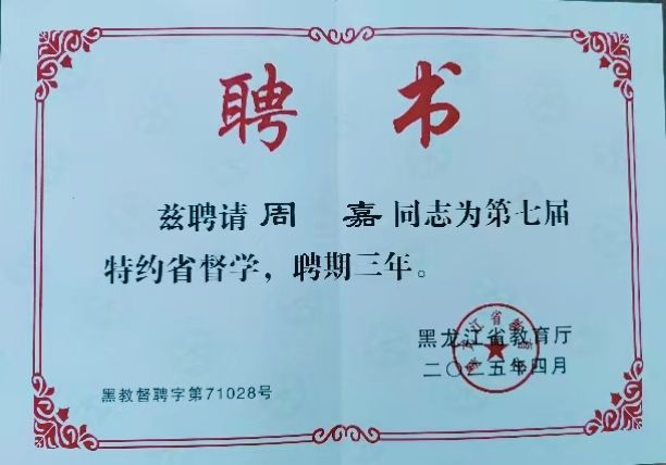 近日,省教育厅为第七届特约省督学颁发聘书。我校省政协委员、民盟哈师大委员会主委杨超,省政协委员、九三学社哈师大委员会主委周嘉两位党外人士受聘担任第七届特约省督学。