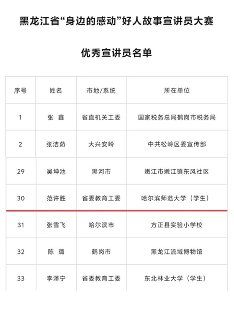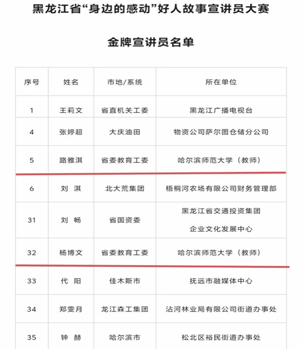 为充分发挥身边好人榜样引领示范作用,在全社会积极营造学习好人、宣传好人、关爱好人、争当好人的浓厚氛围,宣讲好人故事,传递身边感动,省委宣传部(省文明办)于7月举办黑龙江省“身边的感动”好人故事宣讲员大赛,近日比赛结果公布,我校校长办公室展览中心教师路雅淇和东语学院团委副书记、学工办副主任杨博文荣获金牌宣讲员,传媒学院戏剧与影视专业硕士研究生范许胜荣获优秀宣讲员。