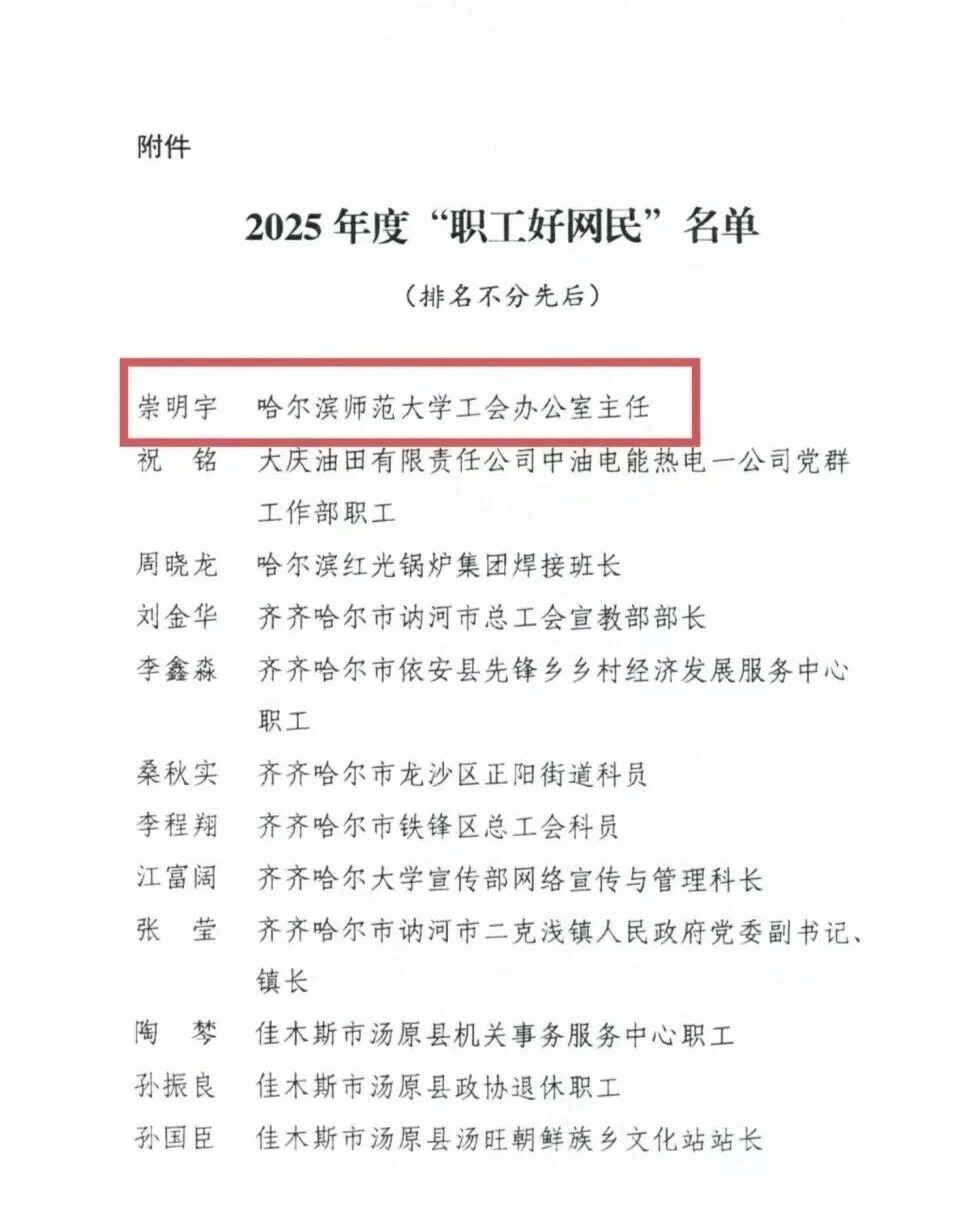 近日,由黑龙江省委网信办联合省总工会共同组织的2025年度“职工好网民”选树活动落下帷幕,我校工会办公室主任崇明宇凭借在网络正能量传播、校园网络文明建设等方面的突出表现,成功获评黑龙江省2025年度“职工好网民”称号,为学校赢得了荣誉.