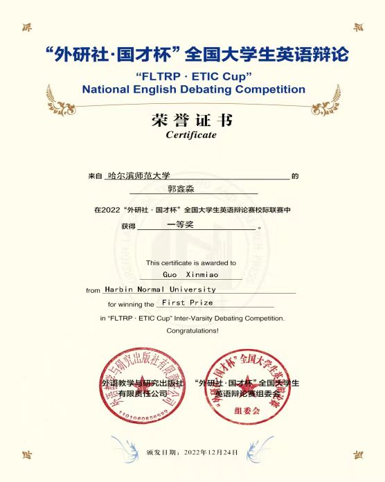 2022年12月24日,由外研社全国大学生英语辩论赛组委会主办的“FLTRP.ETIC Cup”“外研社·国才杯”全国大学生英语辩论赛2022社团招新高校联赛落下帷幕。来自地理科学学院2021级地理科学专业一班的郭鑫淼同学代表哈尔滨师范大学参赛,并荣获公开组一等奖、“个人最佳辩手”荣誉称号。