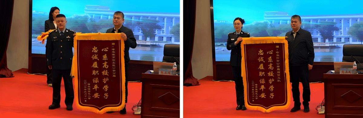 会议伊始,学校向哈尔滨市公安局松北分局、哈尔滨市公安局刑侦支队赠送锦旗,以此感谢公安部门在维护校园及周边治安秩序、保障师生安全等方面提供的坚实支撑。