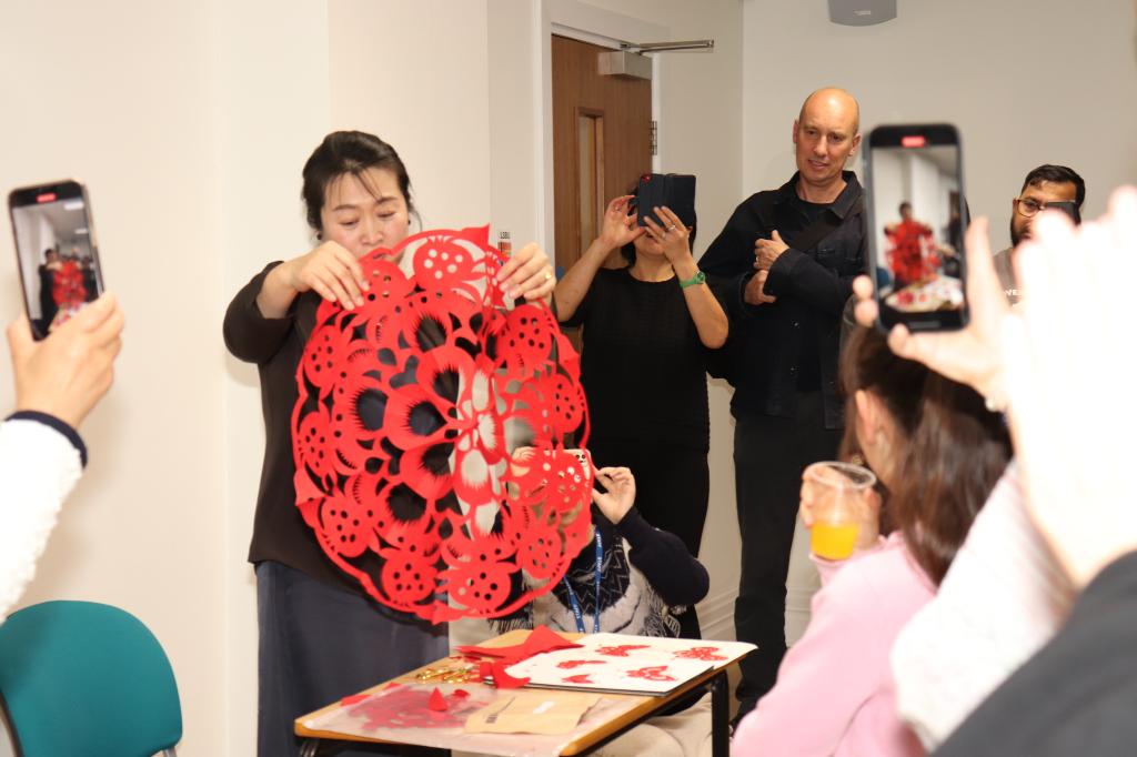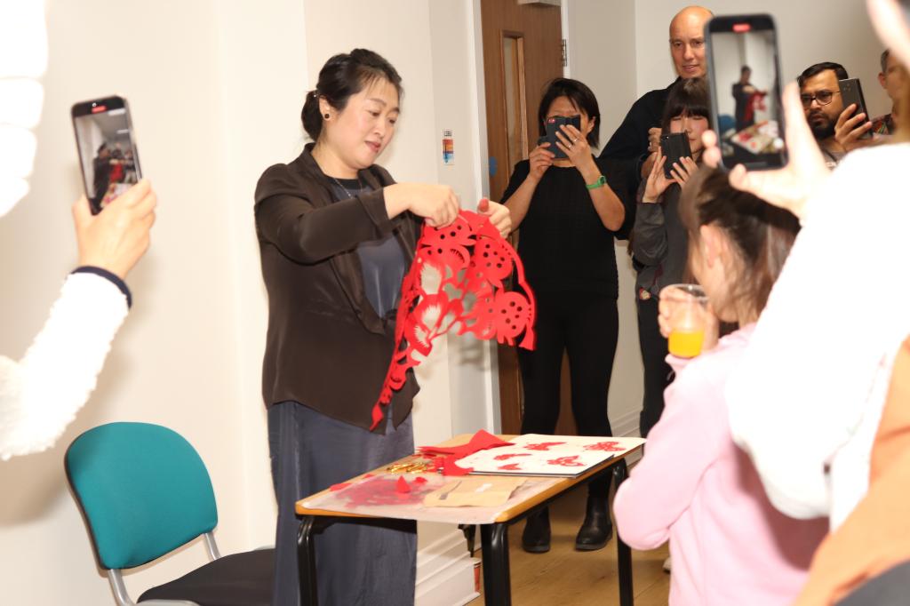 开幕式伊始,伦敦南岸大学副校长DeborahJohnston在致辞中表示剪纸艺术作为一种古老的传统艺术形式,既具有观赏性,又承载着丰富的文化内涵,特别感谢伦敦中医孔院和哈尔滨师范大学举办本次剪纸展览,为师生们提供了更多学习和交流的机会,促进了文化的交流与融合。同时,孔子学院外方院长许亦农教授也同大家分享了一些他对剪纸艺术的见解。
