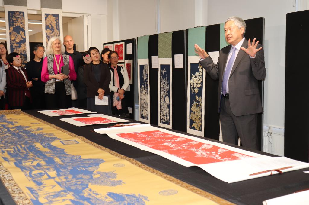(赵雷/文)英国当地时间6月7日晚6点,由伦敦中医孔子学院和哈尔滨师范大学联合主办的“龙江剪刻”剪纸艺术展览的开幕式在伦敦南岸大学可卡斯顿学府隆重开幕。本次展览从6月7日到7月7日,为期1个月。参加开幕式的嘉宾有伦敦南岸大学副校长Deborah Johnston、伦敦中医孔子学院外方院长许亦农教授、伦敦中医孔子学院中方院长王朝辉副教授、盛波副教授、我校龙江艺术团代表闫海涛教授、姚瑞江教授和王仁亮副教授,以及来自伦敦南岸大学和伦敦中医孔院下设教学点的学生和老师近百人。