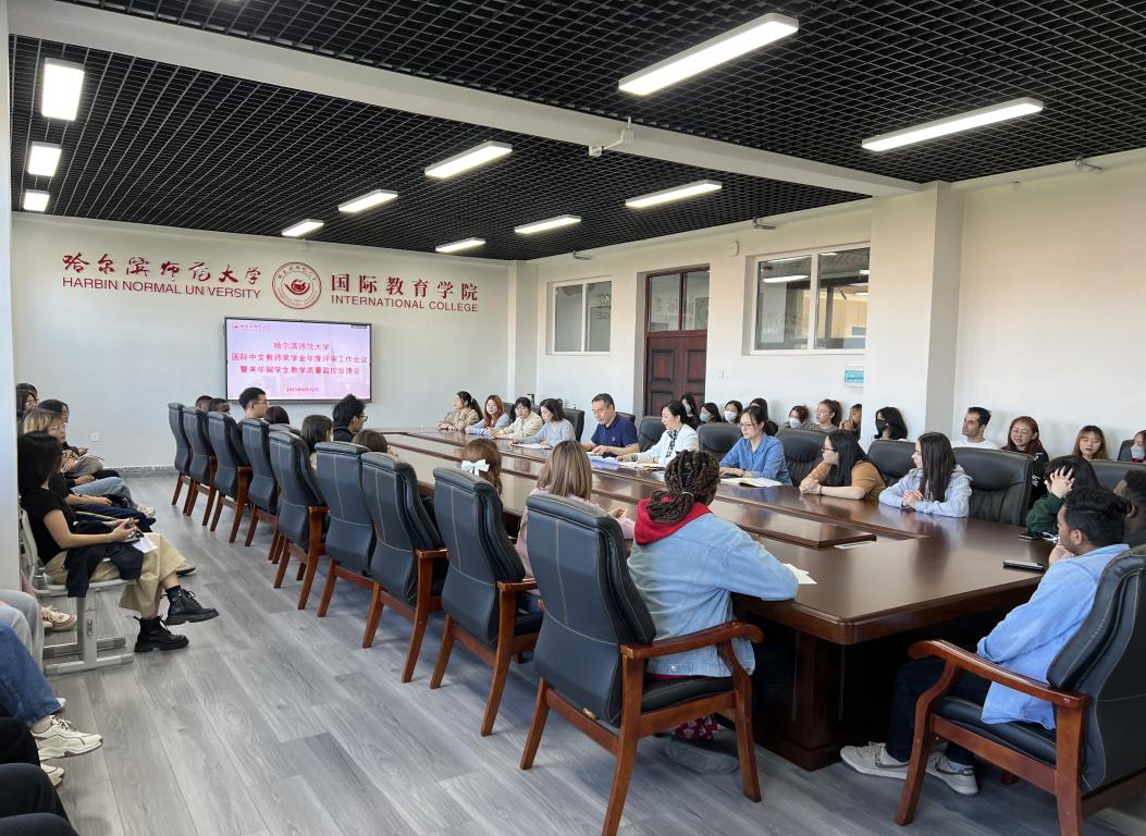 (范晓轩 宋婧/文)9月12日下午,在国际楼513会议室召开哈尔滨师范大学国际中文教师奖学金年度评审工作会议暨来华留学生教学质量监控反馈会。留学生归口管理部门国际教育学院院长张晓涛教授,留学生教学工作负责人李国慧教授,留学生汉语言文化系主任范晓轩、留学生管理办公室副主任宋婧以及留学生代表60余人参加了此次会议。会议由李国慧主持。