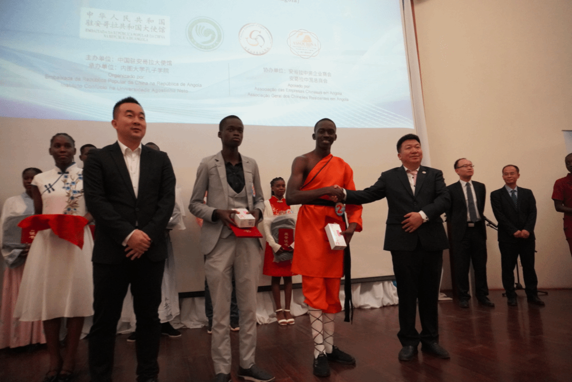 中国驻安哥拉大使张斌、使馆陆玉忠参赞、内图大学校长马加良斯、内图大学孔子学院中方院长赵玉峰、安哥拉中资企业商会会长范军涛、中国总商会会长裴文华,安内政部、高校代表,安中资企业、商会、侨团、中安媒体代表及孔院师生等200余人齐聚一堂,共赏赛事。