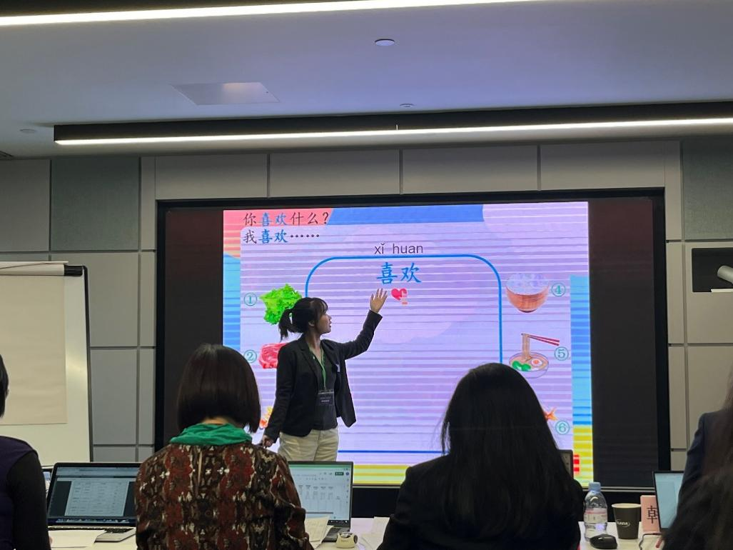 6号选手张雨璇老师的教学对象是汉语初级水平的英国小学生,教学目标是使学生能用“也”来描述生活中的场景。通过丰富的课堂讲解和练习,李老师调动学生多元智能,通过真实的例举和逼真的生活场景扮演,使得学生们迅速理解了“也”的用法。在和评委交流的过程中,李老师凭借着翔实的内容和充分的准备获得评委们的一致好评。