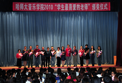 9月8日上午9时,音乐学院在江南礼堂举行了2010“学生最喜爱的老师”颁奖仪式。副校长臧淑英到场讲话,并与获奖教师亲切合影。
