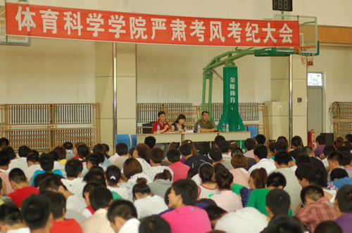 7月1日中午在篮球训练馆,王绍峰在全院学生大会上强调了严肃考风考纪的重要性,并且列举学院近期发生的两起学生违纪事件,起到警示学生的作用。王韶峰指出,学生的考风考纪问题,关系到体科院的声誉,代表着体科院的整体形象,要将遵守考试纪律从个人意义升华到集体价值,充分认识其重要性和严肃性,增强自身的集体荣誉感和责任感,做一名自尊自强、诚实守信的大学生。学院党委书记朱佳颖在大会上向全体学生传达学校关于考试违纪处理方面的相关文件,要求学生做到严肃考风考纪、诚信应考、文明考试,营造优良院风、学风,杜绝考试作弊现象。学院党委副书记冯铁南要求广大党员、学生干部发挥表率作用,带头维护考风考纪,拒绝弄虚作假,远离考试作弊,做一名优秀的共产党员和学生干部。