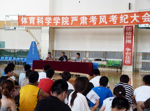 6月27日,体育科学学院于我校体育馆召开“拒绝作弊,做文明诚信大学生”考风考纪动员大会。学院党委副书记冯铁南出席会议。学院09级、10级、11级共900余名同学参加了动员大会。