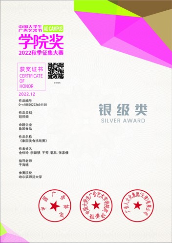 2022年12月22日,由中国广告协会举办的“中国国际广告节·中国大学生广告艺术节学院奖2022秋季征集大赛举行颁奖盛典",此次盛典在厦门国际会展中心隆重举行。哈尔滨师范大学传媒学院于海礁老师指导的两部作品《一“鹭”送上美好生活》和《象国美食挑战赛》获得金奖和银奖。