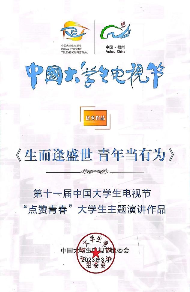 (于曜铭/文)2023年3月24日至26日,由中国文学艺术界联合会、中国电视艺术家协会、中国传媒大学联合主办,中国教育电视台、福州市人民政府承办的第十一届中国大学生电视节在福建省福州市隆重举行。由传媒学院教师祁博指导,哈尔滨师范大学传媒学院2020级播音与主持艺术系本科生李思奇创作的作品《生而逢盛世 青年当有为》荣获“点赞青春”大学生主题演讲优秀作品,并于活动中公开展映。