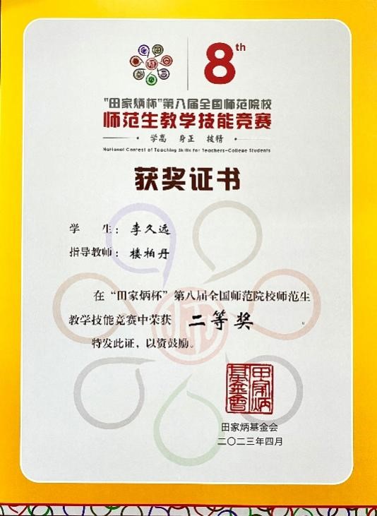 从初赛到决赛的备赛过程中,楼柏丹从教学内容的处理、教学方法的选用、教学设计的创新、PPT的设计、板书的书写等方面对李久远进行了全面细致地指导。李久远通过不断地训练和反复地打磨细节,个人教学能力和水平得到了很大的提高,并在决赛中展现出良好的教学素养与精神风貌,最终取得二等奖的优异成绩。