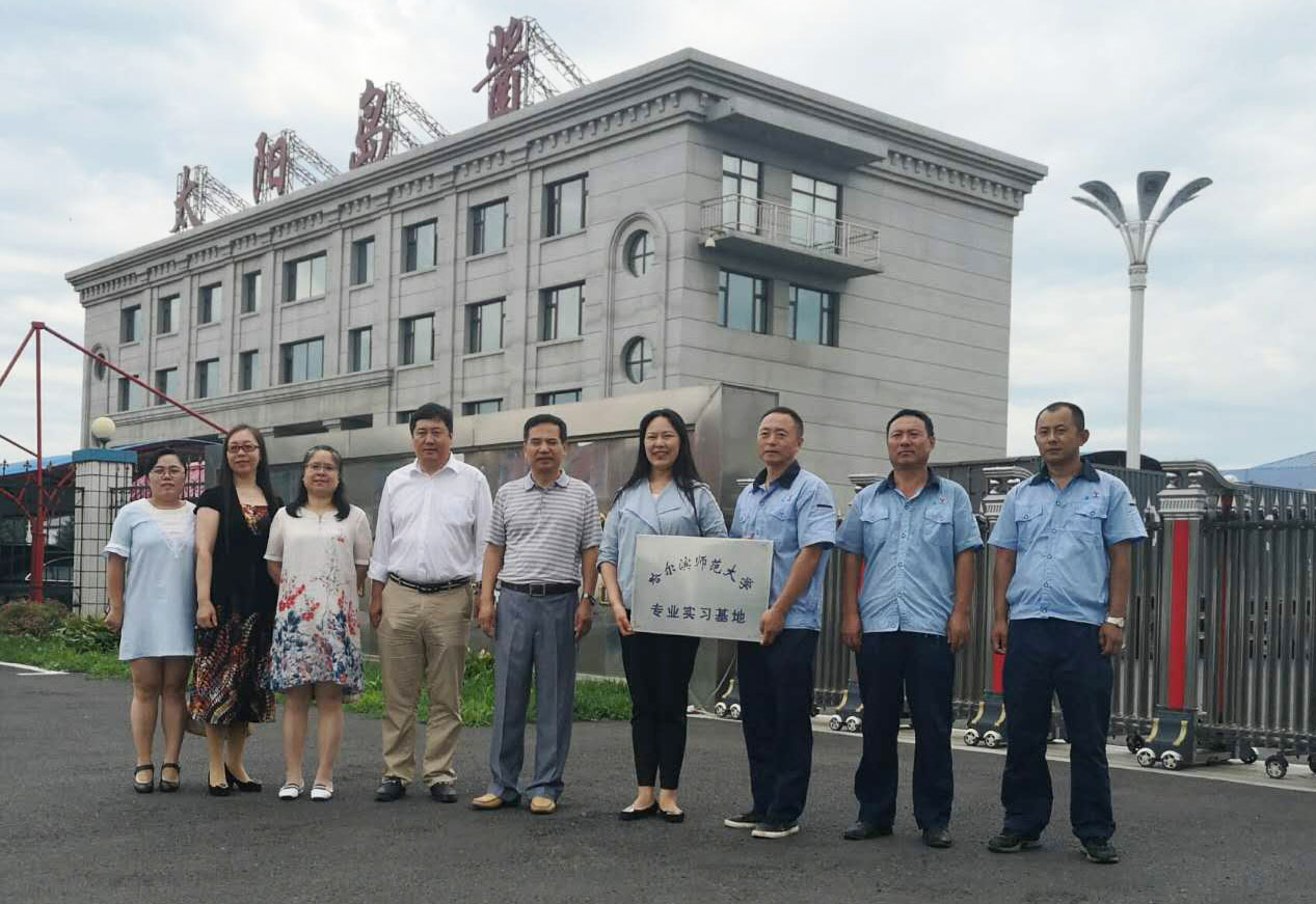 (井乐刚/文)6月29日上午,生命科学与技术学院生物技术专业实习基地挂牌仪式在哈尔滨鑫天食品有限公司举行。生命科学与技术学院院长于丽杰、党委副书记高阳、副院长丁国华、副院长郭东林、副处级辅导员李凤、副教授唐高霞,哈尔滨鑫天食品有限公司董事长兼总经理王玉鑫、副总经理张东等出席挂牌仪式。于丽杰和王玉鑫共同为哈尔滨师范大学专业实习基地揭牌。