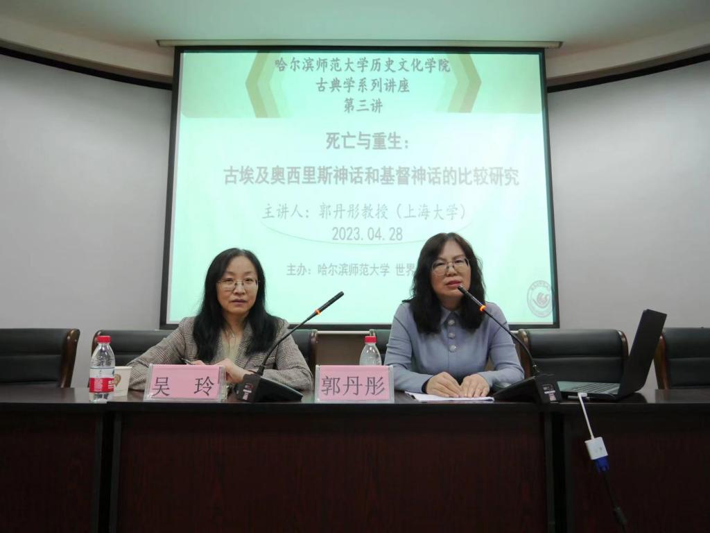 为贯彻落实党的二十大精神,深入开展学习贯彻习近平新时代中国社会特色社会主义思想主题教育,进一步推动学院高质量发展,加强我院世界史学科建设,2023年4月28日上午8:30,历史文化学院举办古典学系列讲座第三讲,特邀上海大学历史学系教授、博士研究生导师郭丹彤教授,在人文楼516多功能报告厅作了题为“死亡与重生:古埃及奥西里斯神话和基督神话的比较研究”的学术讲座。讲座由吴玲教授主持,学院教师及百余名博士、硕士研究生和部分本科生聆听此次讲座。