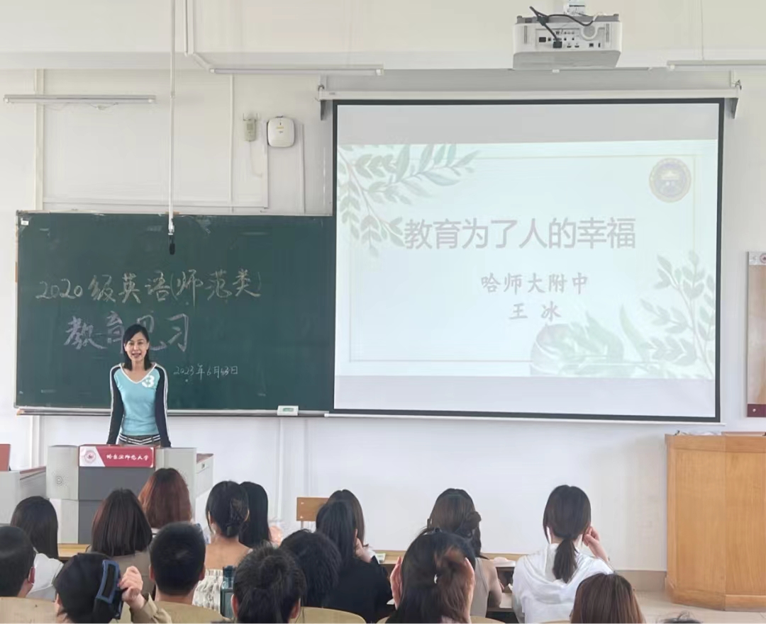 (徐伟伟/文)6月13、14日上午,为进一步提升师范生英语教学技能,提高教育教学水平,学习优秀教学经验,哈尔滨师范大学西语学院英语教育系精心策划了两场师范生教育见习讲座,两位来自省内一线顶级高级中学的英语教研组长为学生们提供了难得的学习机会,增强了英语师范生的教育教学能力和专业素养。西语学院教学院长张春玲、英语教育系副主任张晓恬、2020级辅导员蒋雨材参加了见习活动。