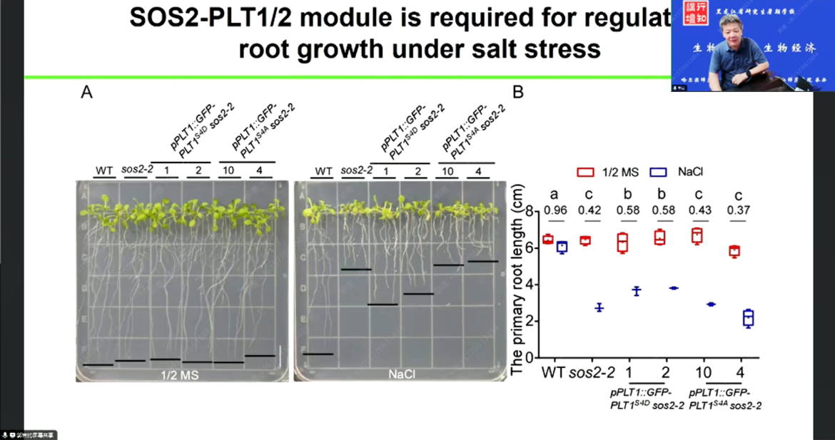 在报告中郭岩教授介绍了盐胁迫对植物的生长发育以及农作物的产量所造成的损害。面对复杂多变的盐胁迫,植物必须主动调控生长发育,以适应逆境环境。根毛是植物根系的重要组成部分,在扩大植物根系与土壤的接触面积、增加养分和水分的吸收等方面发挥重要作用,被认为是环境信号的“整合器”。郭岩教授分享了其团队在植物根系响应盐胁迫的分子机制方面取得的最新研究进展。他们发现,在盐胁迫条件下,GSO1激活了激酶SOS2促进植物细胞通过SOS1进行钠离子的外排。SOS2的GSO1依赖性激活可以独立于SOS3而发生。GSO1介导的SOS调控模块将根部发育分化与细胞解毒相互联系,促进了内胚层盐外排和分生组织干细胞的保护,从而优化盐胁迫恢复能力。