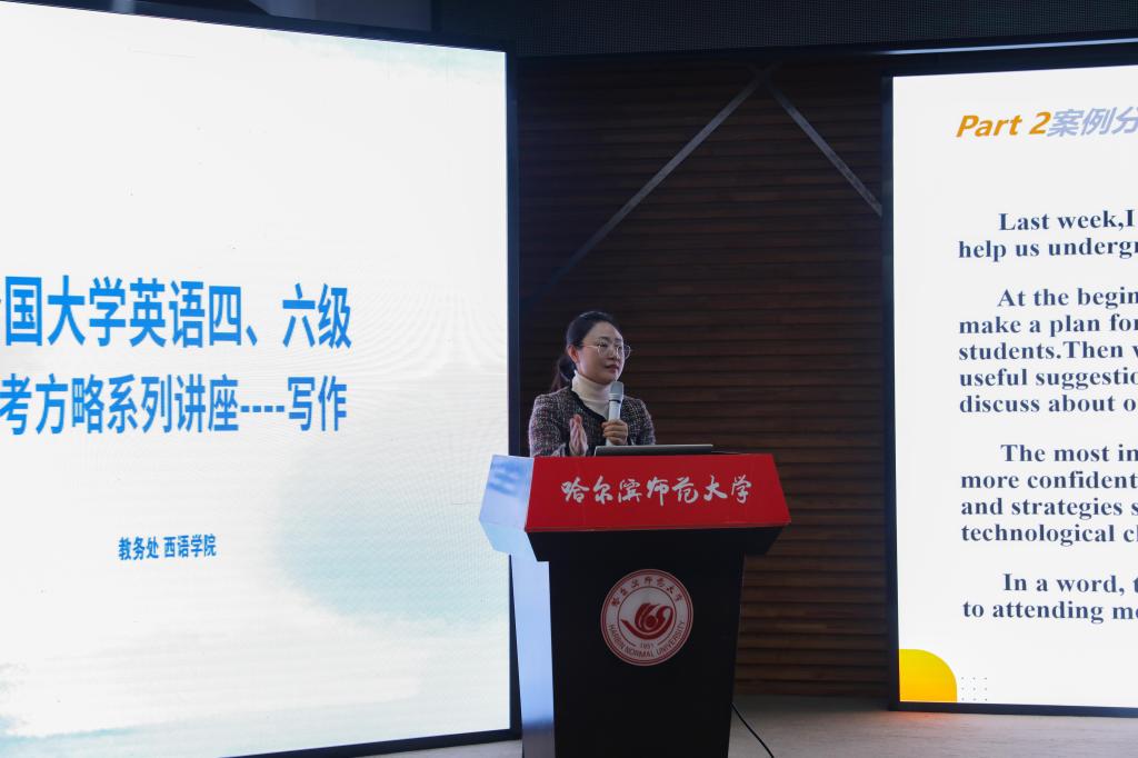 本场写作专题讲座主讲教师是西语学院丁玲玲副教授,硕士生导师,曾获“第七届哈尔滨师范大学优秀中青年教师教学奖”,2021年外研社全国“教学之星教学大赛团队特等奖”;曾多次担任大学英语四、六级考试写作阅卷员、领队等工作,具有丰富的实践经验。
