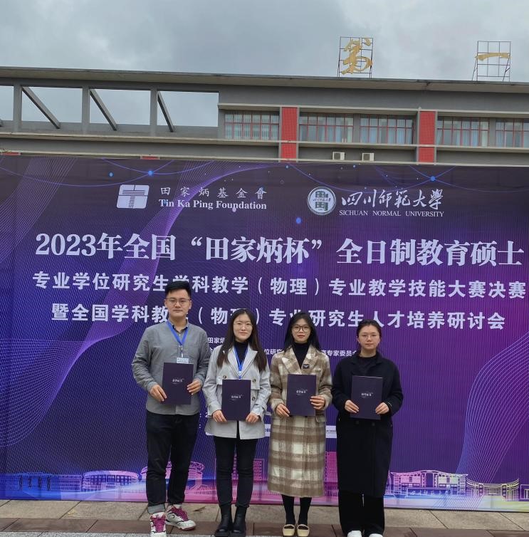 (张迪/文)11月9日-12日,全国“田家炳杯”全日制教育硕士专业学位研究生学科教学(物理)专业教学技能大赛决赛暨全国学科教学(物理)专业研究生人才培养研讨会在四川师范大学举行,由我校教师教育学院学科教学(物理)专业团队张迪、马佳宁、赵振宇、张洁静四位老师共同指导的2022级研究生刘炎秋获得一等奖、谢锈蓉获得二等奖、曾子健获得优秀教学设计奖,张迪、赵振宇获得优秀指导教师奖。