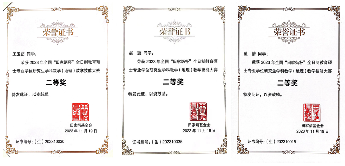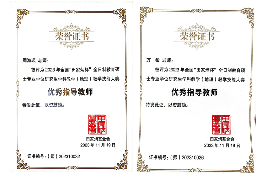 (万敏/文)11月19日,全国“田家炳杯”全日制教育硕士专业学位研究生学科教学(地理)教学技能大赛决赛在南京师范大学顺利落下帷幕。由我校教师教育学院学科教学(地理)专业教师周海瑛、万敏和王玮共同指导的2022级研究生董倩、赵璐、王玉茹荣获二等奖,周海瑛、万敏获得优秀指导教师奖。