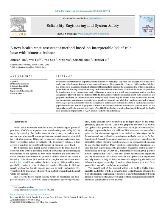 (季伟东/文)我校计算机科学与信息工程学院贺维老师研究团队,在人工智能的可解释性建模、多目标平衡优化研究领域取得重要进展。研究成果“A new health state assessment method based on interpretable belief rule base with bimetric balance”在国际著名学术期刊Reliability Engineering & System Safety上发表,期刊为工程技术Top期刊,影响因子8.1。论文第一作者为计算机科学与信息工程学院2022级计算机技术专业硕士研究生尹修贤。这是我校首次以第一单位在该刊物上发表人工智能领域方面的文章。