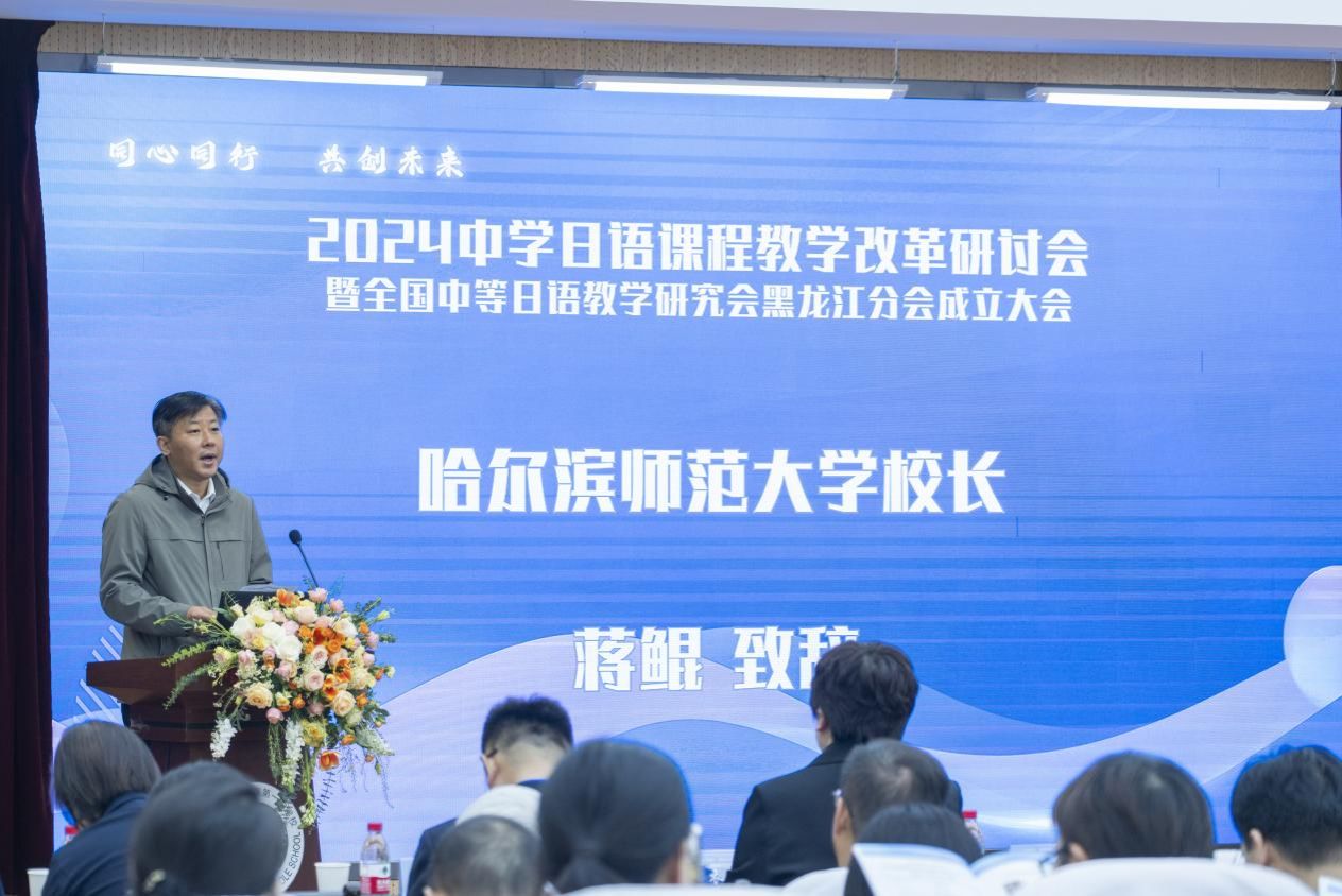 蒋鲲代表哈尔滨师范大学致辞,他表示,我校始终坚持社会主义办学方向,落实立德树人根本任务,致力于服务龙江基础教育。为深入贯彻落实教育部等多部委提出的“实施新时代基础教育扩优提质行动计划”,特牵头成立全国中等日语教学研究会黑龙江分会,学校将继续发挥学科专业优势,为推动龙江基础教育日语课程高质量发展,加快推进教育强国建设作出哈师大贡献。