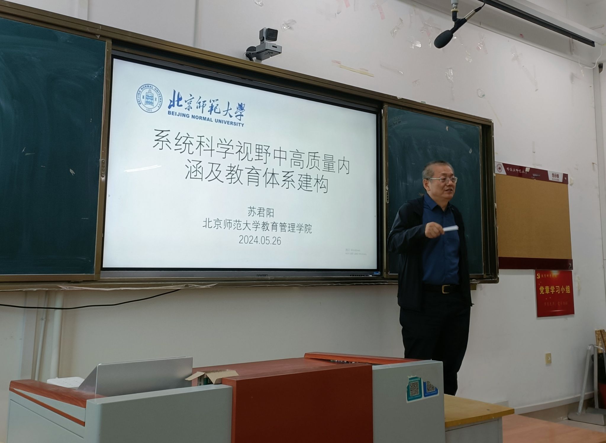 (孙芳/文)5月26日下午,北京师范大学苏君阳教授应教育科学学院邀请,在社科楼427教室做了题为《系统科学视野中高质量内涵及教育体系建构》的学术讲座。教育学、教育经济与管理、比较教育等专业的师生听取了讲座。讲座由教育经济与管理教研室主任李玉副教授主持。