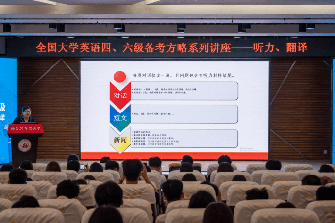 (才亚楠/文)为指导学生高效、精准地备考2024年全国大学英语四、六级考试、提升应试技巧,教务处联合西语学院于5月24日下午在梦溪报告厅举办了2024年第二场全国大学英语四、六级备考方略系列讲座。相关部门领导、部分教师与来自全校各专业的大一学生代表近200人参加了此次讲座。