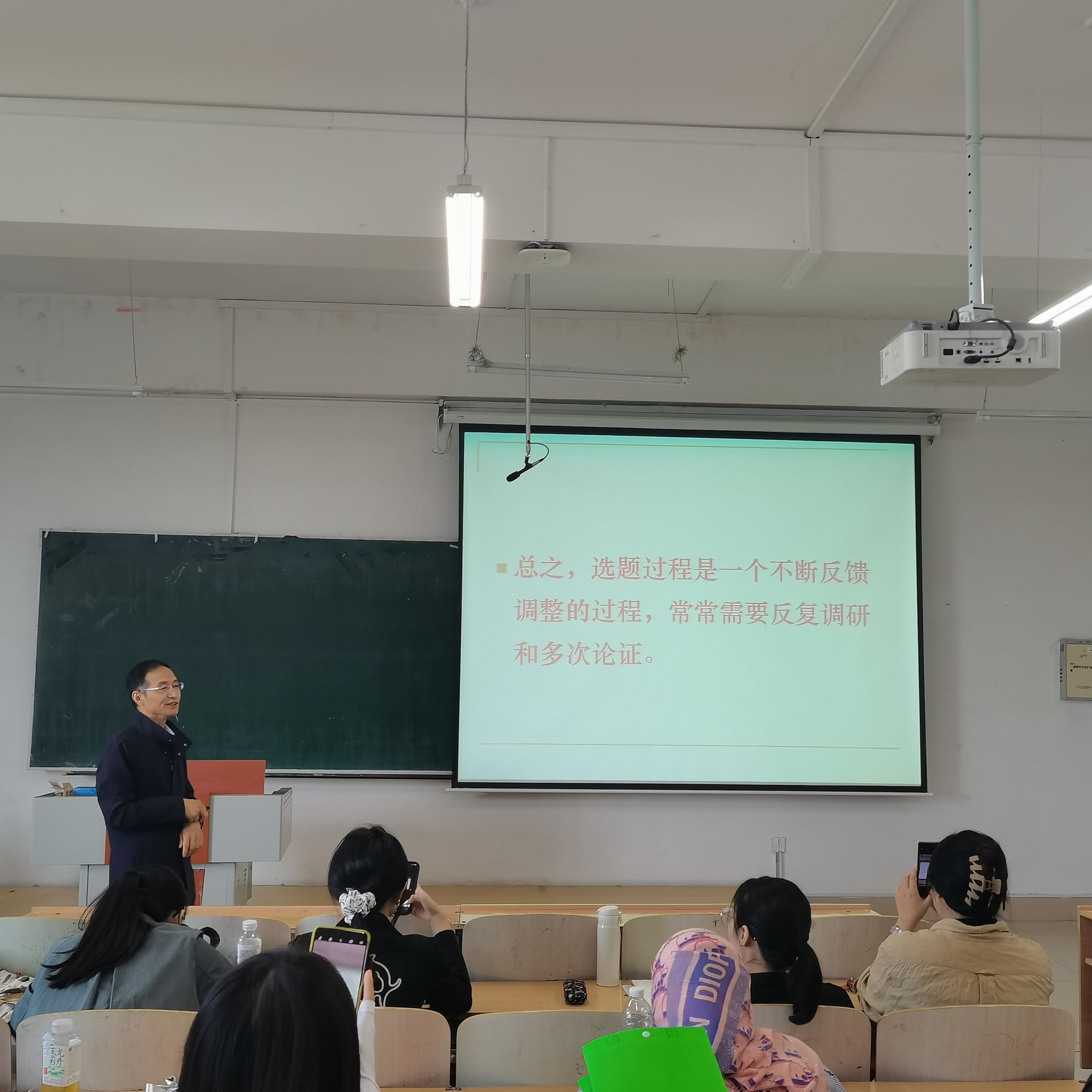 潘洪建以“教育类课题如何选题以及论证”为切入点,从研究题目的产生与提炼、课题论证两个方面进行分享。潘洪建指出,在研究题目的产生与提炼方面,首先,应基于需要性原则和创造性原则,在学科之间的相互交叉和相互渗透的“边缘区”“结合部”“交叉点”进行选题;其次,课题研究问题要坚持问题导向,从近年在知名期刊发表的学术论文、优秀博士论文的结语、近年立项的国家基金项目中综合相关题目,寻找自身感兴趣的选题;再次,应在文献调研和科学分析、提出选题初步论证的基础上评议和确定课题选题;最后,在表述研究题目时要用语规范、问题突出、具有新意、名称简洁。在课题论证方面,潘洪建重点从课题申报书的撰写以及申报书的修改与完善进行了讲解,并通过具体的案例进行分析。潘洪建结合自身的申报经验以及相关案例,深入浅出、形象具体地向师生们讲解了教育科研课题的申报要领,赢得了参会师生的热烈掌声。