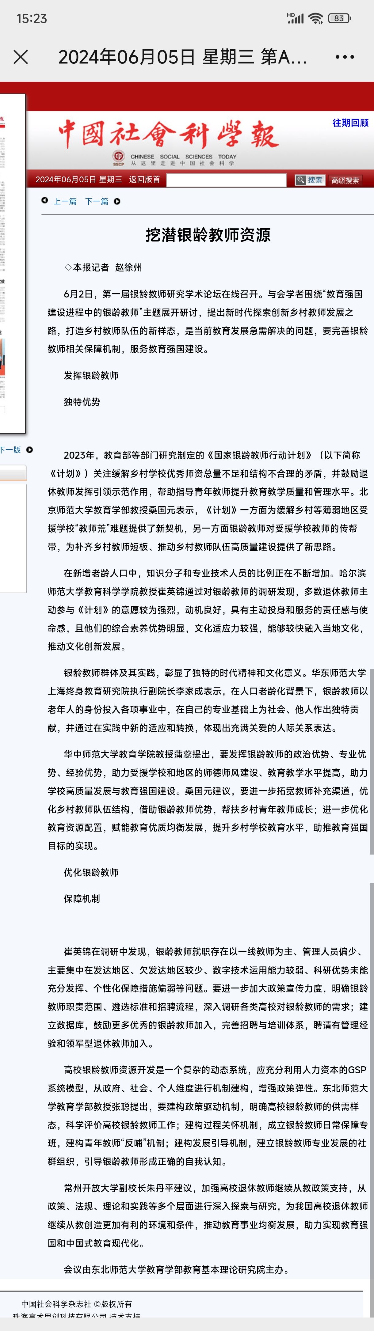 (林善城/文)6月2日,由东北师范大学教育学部教育基本理论研究院主办的第一届银龄教师研究学术论坛在线上举行,我校教育科学学院博士生导师崔英锦教授受邀在会上做了题为《银龄教师就职现状及助推高等教育动能分析》的调研报告。崔英锦在报告中指出了银龄教师队伍面对《国家银龄教师行动计划》的状态、银龄教师就职现状与存在的问题,并提出应对策略。崔英锦的报告受到与会学者们的好评。