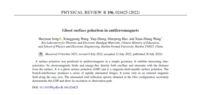 (张强/文) 近日我校教育部重点实验室王选章研究团队在简单位型下的反铁磁体表面上预言了另一种幽灵表面极化子,它的强度在垂直于表面方向形成干涉条纹,其电磁场在该方向呈现震荡衰减的特征,成果已于近期发表在Phys.Rev. B 106, 024425(2022)。
