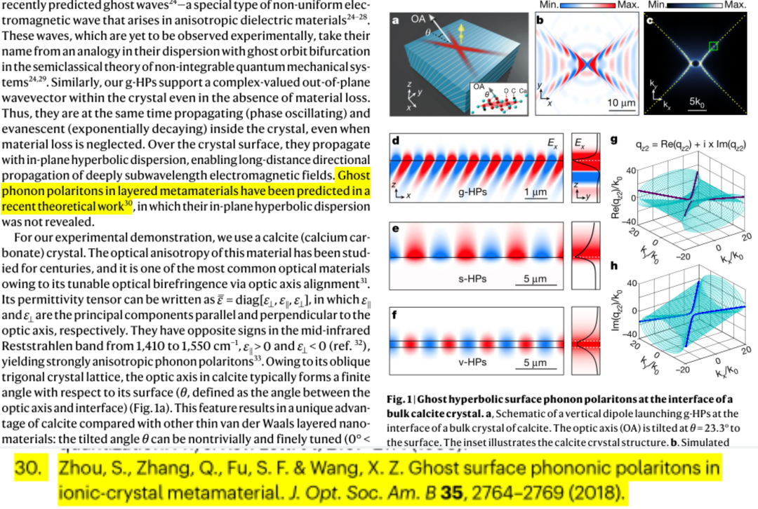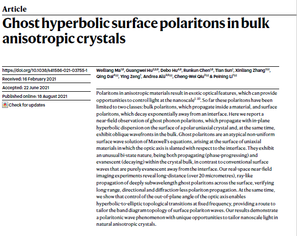 幽灵表面极化子的概念最先由该团队于2018年(J.Opt.Soc.Am.B 35(11) 2764-2769)提出并预言,并于2021年被华中科技大学、新加坡国立大学、国家纳米科学中心与纽约州立大学等单位合作,在方解石晶体中实验上观测到,相应成果发表于自然杂志(Nature 596, 362-66(2021))。这种被称为第三种极化激元的模式是一种新型准粒子,是由光场与物质在表面上相互作用而形成,也是一种新的电磁波表面态。这种教科书式的结果丰富了极化子光学、光物理和凝聚态物理的内涵,在表面光学、亚波长成像、红外及THz领域有潜在的应用。